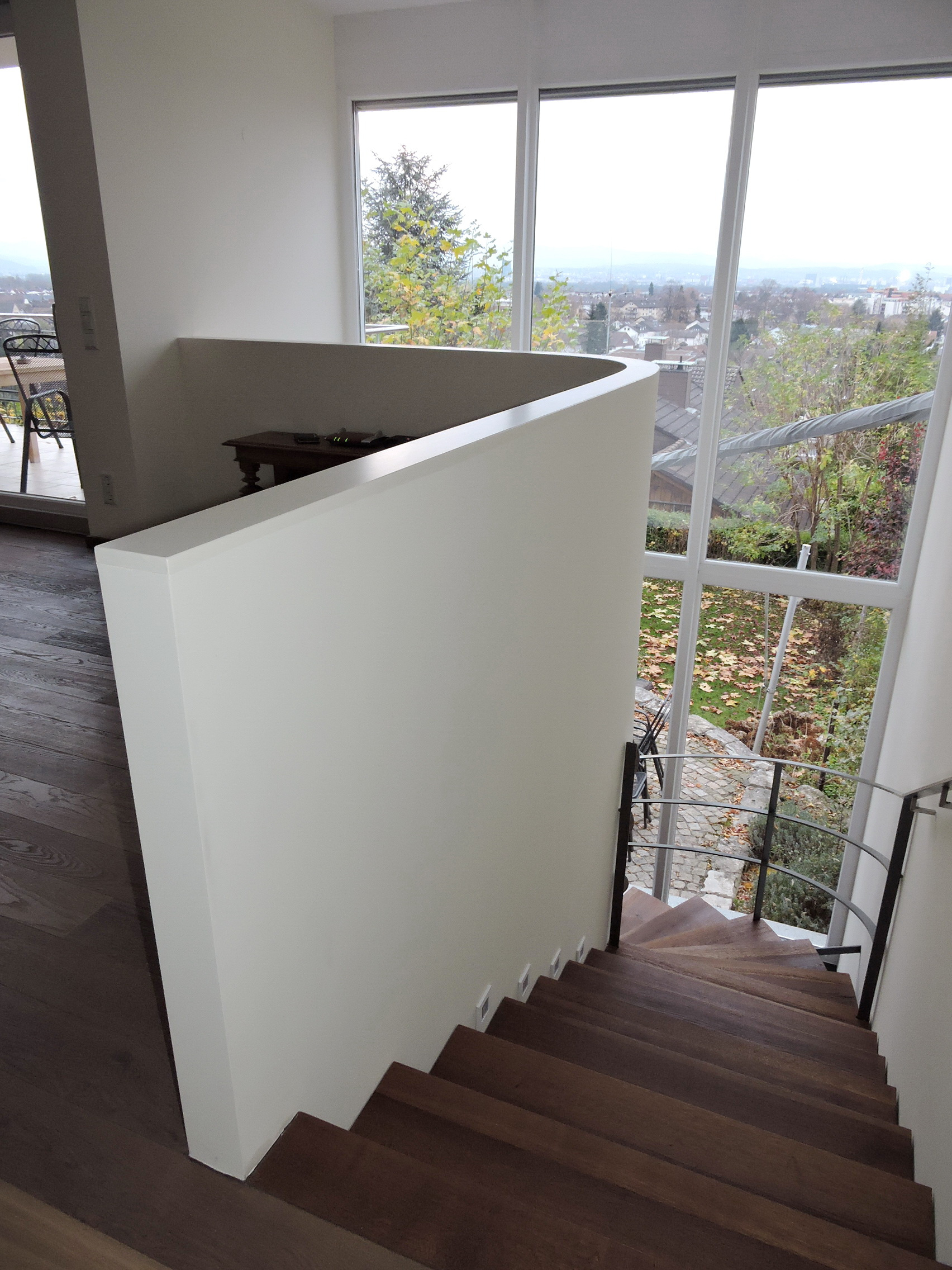 Die vorhandene, sehr groß dimensionierte Treppe zwischen Erdgeschoss und Gartengeschoss wurde durch eine filigrane, individuell geschwungene Treppe ersetzt. Dadurch entstand zusätzliche Wohnfläche im Erdgeschoss für eine gemütliche Sofaecke neben dem Esstisch, die durch die runde Treppenwand Rückhalt bekommt.
