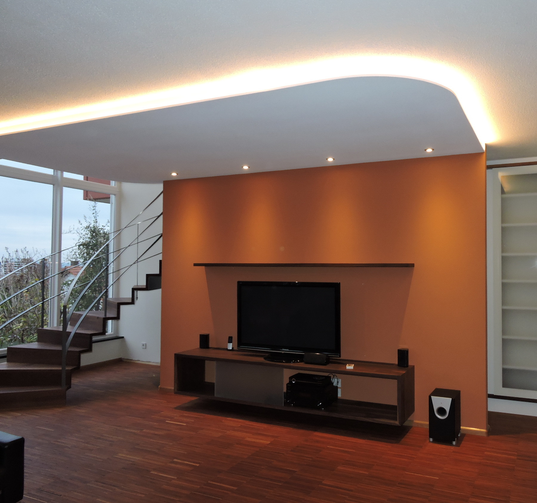 Die neue abgehängte Akustik-Decke mit indirekter dimmbarer LED-Beleuchtung schafft zusammen mit der farbigen Wand und einem neuen Kaminofen ein angenehmes Raumgefühl.