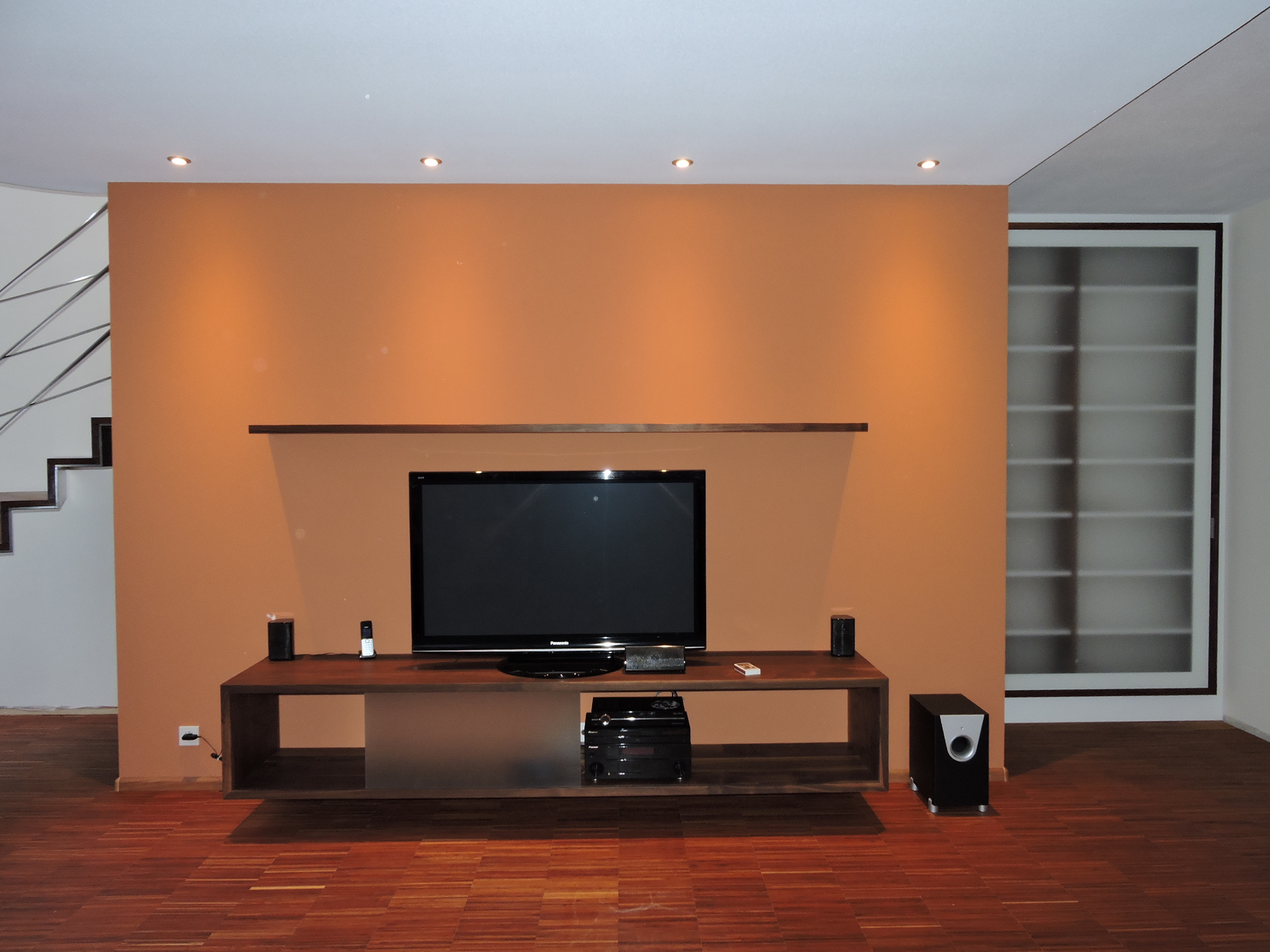 Ausserdem wurde der Wohnraum im Gartengeschoss mit einer neu eingestellten TV-Wand gegliedert, dahinter ergibt sich zusätzlicher Stauraum in einer raumhohen Schrankwand mit Schiebetüren.