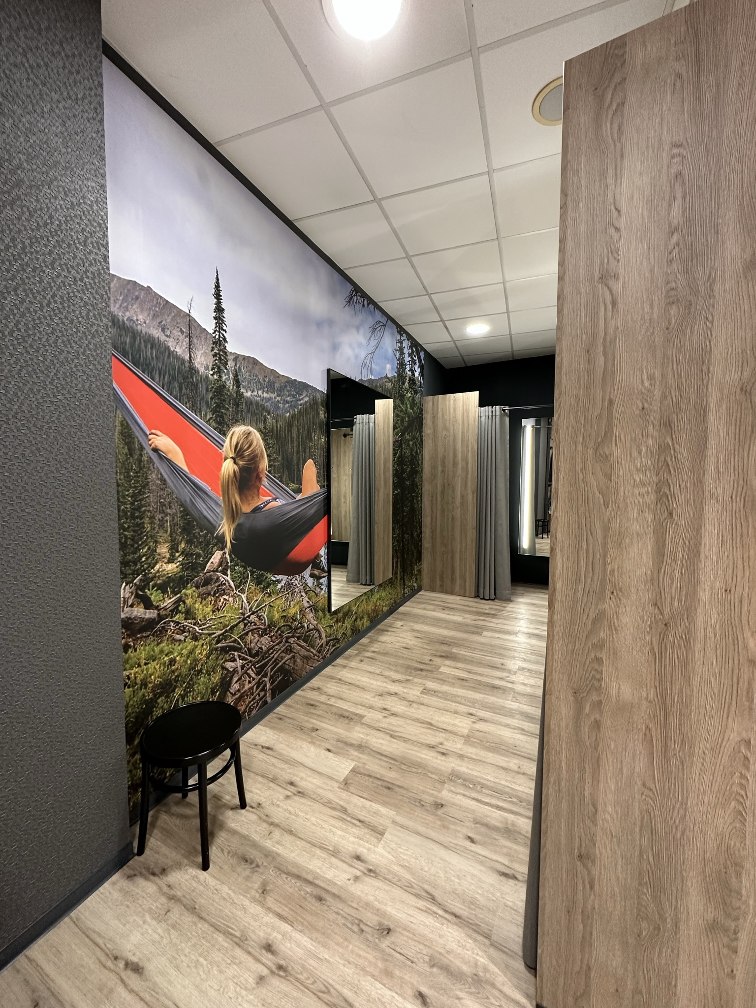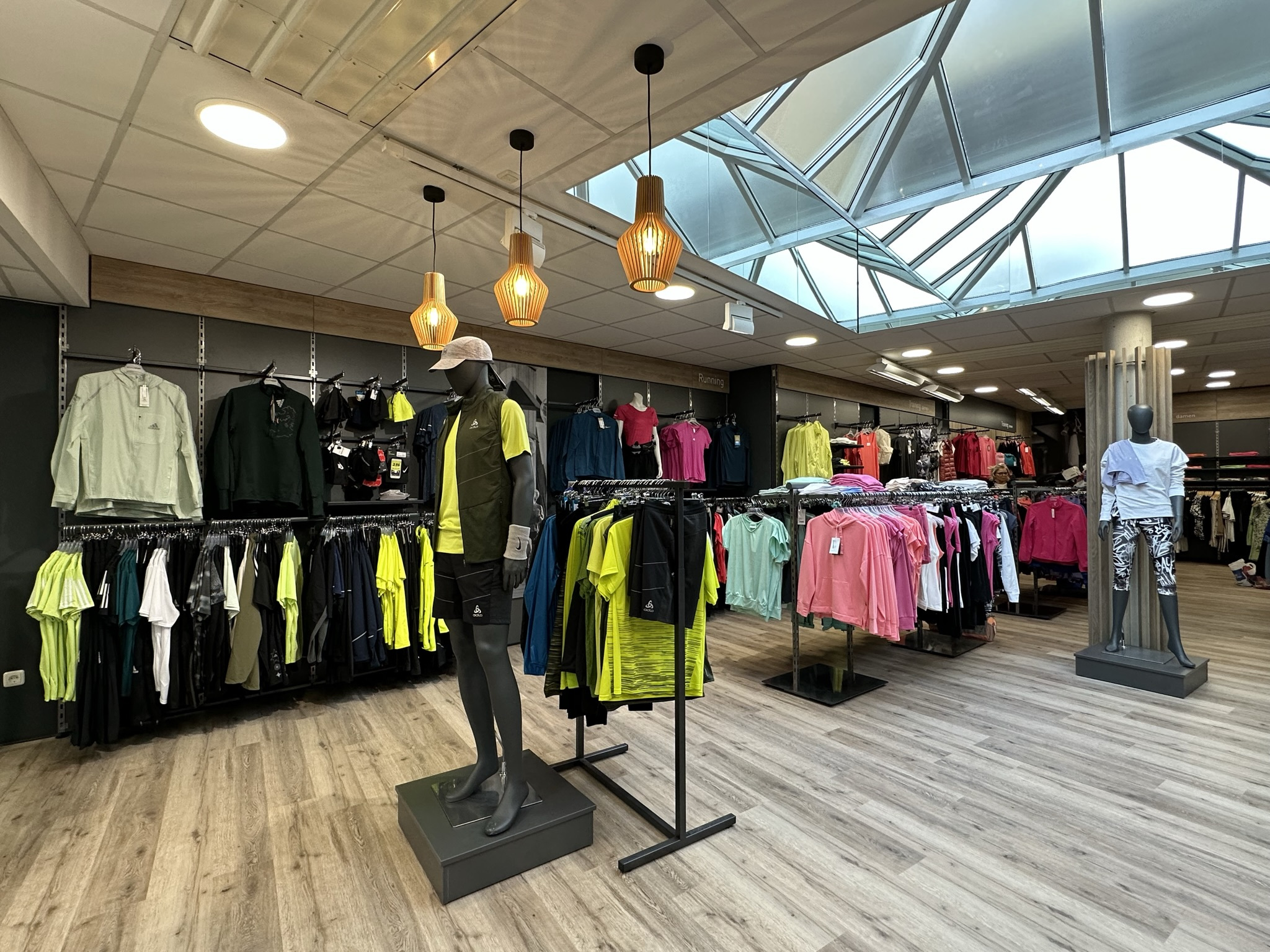 Die Gestaltung mit dunklem Mauerwerk und nach Kategorien aufgebauten Warenwänden unterstützt den Verkauf und hilft dem Kunden bei der Vorauswahl. Ein wohnlicher Boden in Parkettoptik, Metall, Steinwände und eine coole Tapete sowie viele Animationsfotos aus dem Sportlerleben runden den neuen Geschäfts-Auftritt ab und schaffen eine anregende Verkaufsfläche, die Kunden und Mitarbeiter begeistert.